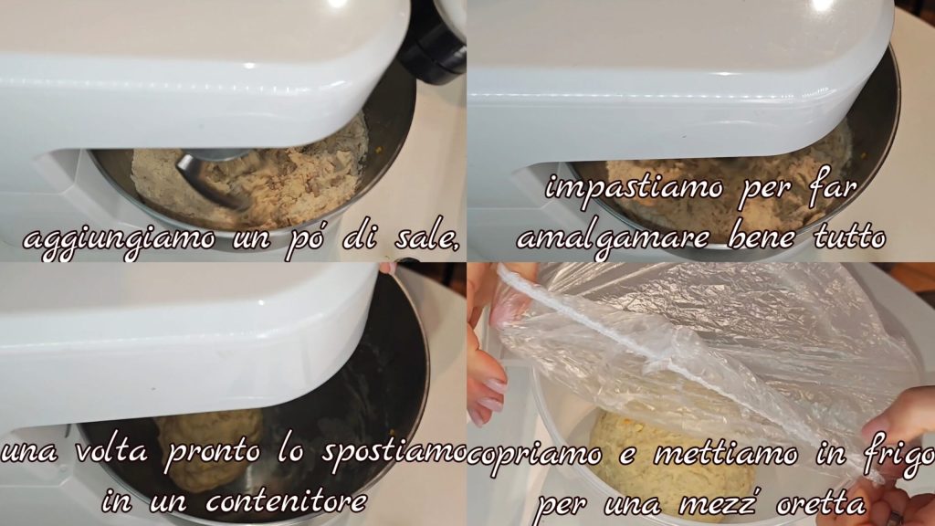 Adicionamos um pouco de sal e amassamos até misturar bem os ingredientes. Quando estiver pronto, colocamos em um recipiente, cobrimos e colocamos na geladeira por cerca de meia hora.