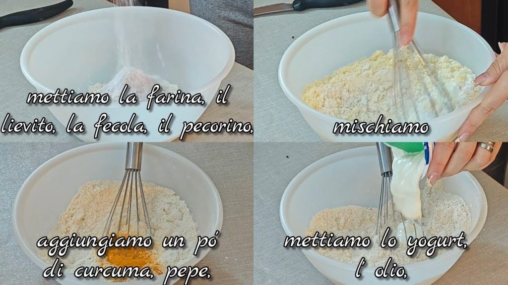 Em um recipiente, colocamos a farinha, o fermento, a fécula, o queijo pecorino e misturamos. Adicionamos um pouco de cúrcuma, pimenta, iogurte, óleo,