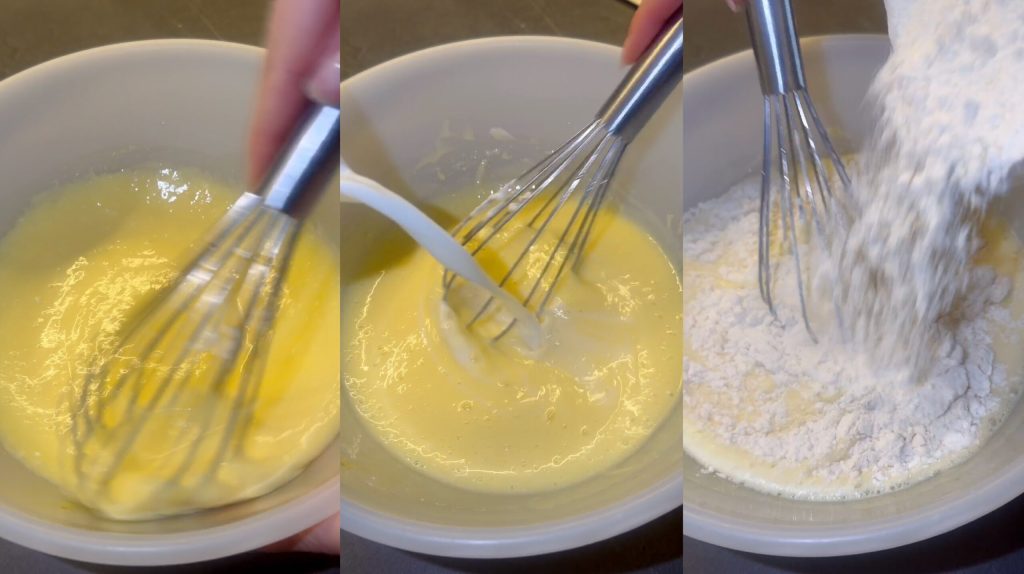 Primeiro quebro os ovos em uma tigela, adiciono uma pitada de sal e bato com um batedor.