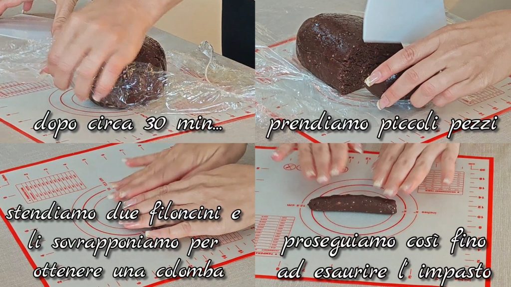 Após cerca de 30 minutos, pegamos pequenos pedaços e estendemos dois bastões. Os colocamos sobrepostos para formar a pomba. Continuamos assim até terminar a massa!