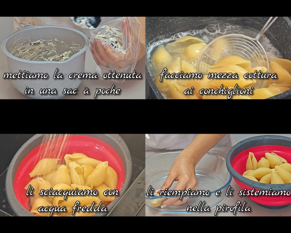 Transfira o recheio para um saco de confeitar para facilitar o preenchimento dos conchiglioni. Cozinhamos os conchiglioni: