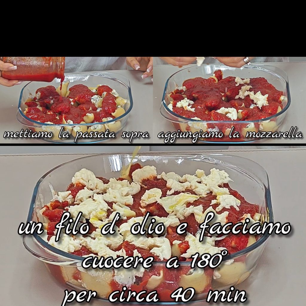 Adicione a passata de tomate sobre os conchiglioni recheados, a mussarela em pedaços, um fio de óleo e os temperos a gosto. Asse a 180°C por cerca de 40 minutos, até que a superfície esteja dourada e a mussarela derretida.