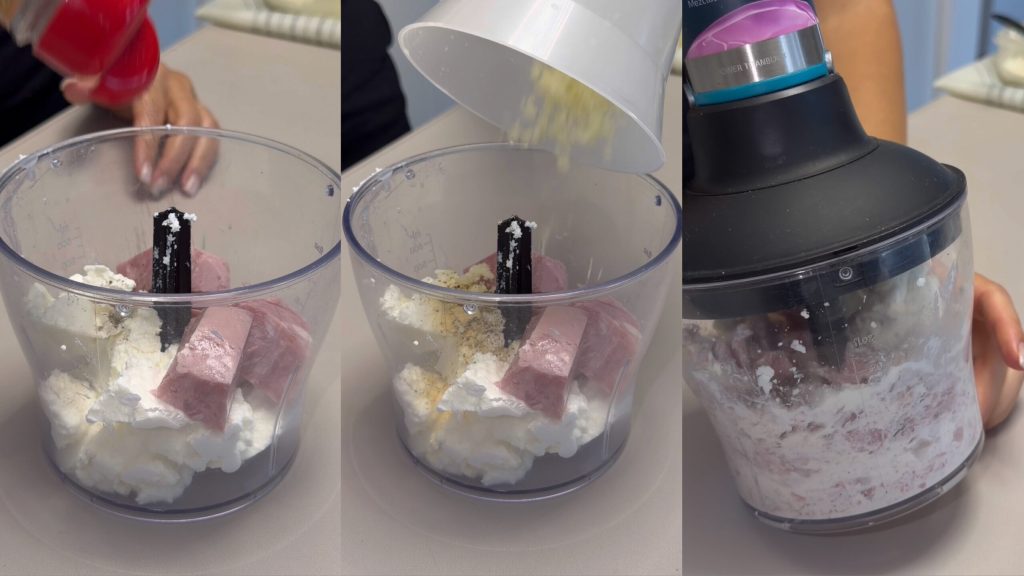 Coloque o queijo cremoso, a ricota, o presunto cozido, o parmesão e especiarias a gosto. Bata até obter um creme homogêneo.
