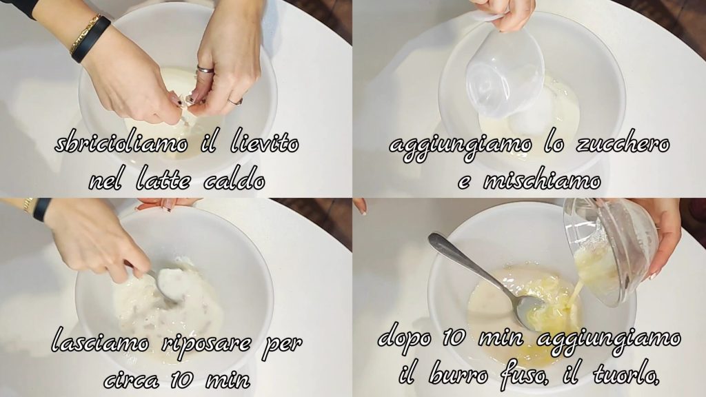 Em uma tigela esfarele o fermento no leite quente, adicione o açúcar e deixe descansar por cerca de 10 min. Após 10 min adicione a manteiga derretida, a gema,