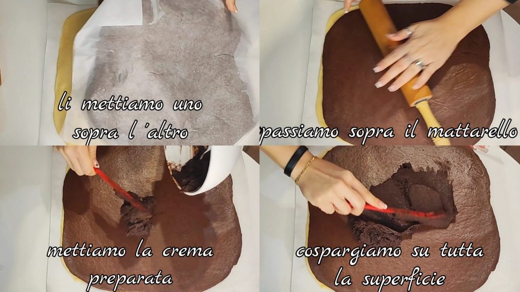 Coloque uma sobre a outra. Passe o rolo por cima para compactar bem. Coloque o creme por cima e espalhe por toda a superfície.