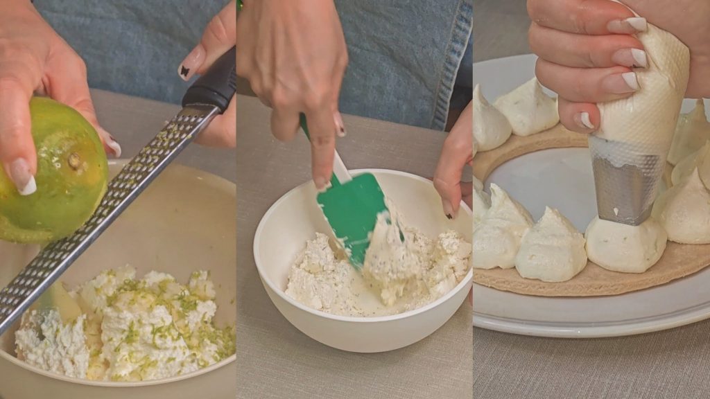 Em uma tigela, misture a Philadelphia com ervas e a ricota até obter um creme liso. Adicione o parmesão, se desejar um sabor mais forte. Se o creme estiver muito grosso, amoleça com uma colher de sopa de creme de leite fresco ou leite. Ajuste com pimenta-do-reino e, se desejar, raspas de limão ou cebolinha. Transfira o creme para um saco de confeiteiro para rechear a cream tart.