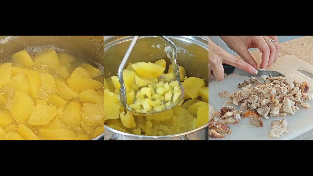• Cozinhe as batatas em água salgada abundante até ficarem macias. Escorra, descasque e esmague com um espremedor de batatas até obter um purê liso.