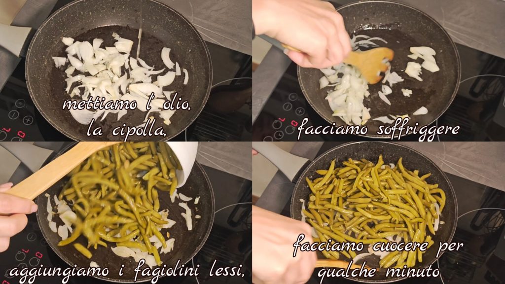 Em uma panela colocamos um fio de azeite, a cebola e deixamos dourar. Adicionamos as vagens cozidas e deixamos cozinhar por alguns minutos.