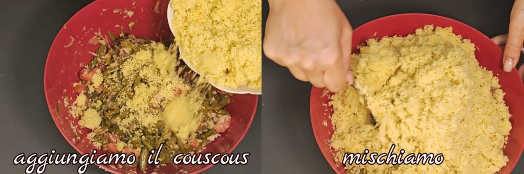 Adicionamos o cuscuz e misturamos bem. Adicionamos sal se necessário!