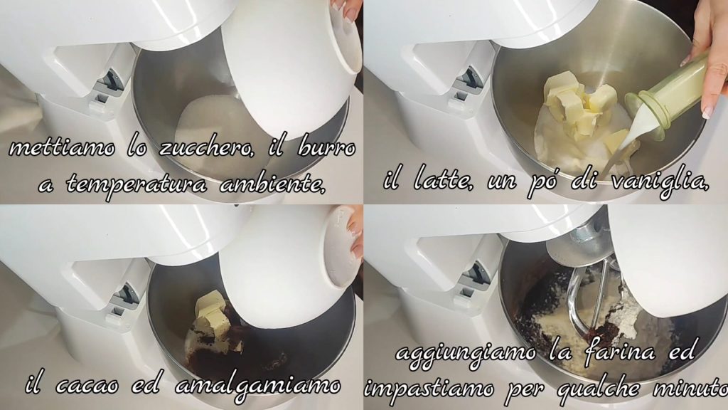 Colocamos o açúcar, a manteiga em temperatura ambiente, o leite, um pouco de baunilha, o cacau e misturamos. Adicionamos a farinha e amassamos por alguns minutos.