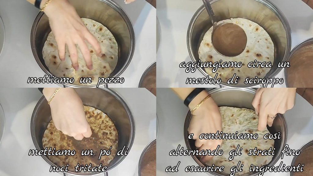 Colocamos um primeiro pedaço, adicionamos cerca de uma concha de calda e um pouco de nozes picadas. Continuamos assim, alternando as camadas até acabar com todos os ingredientes.
