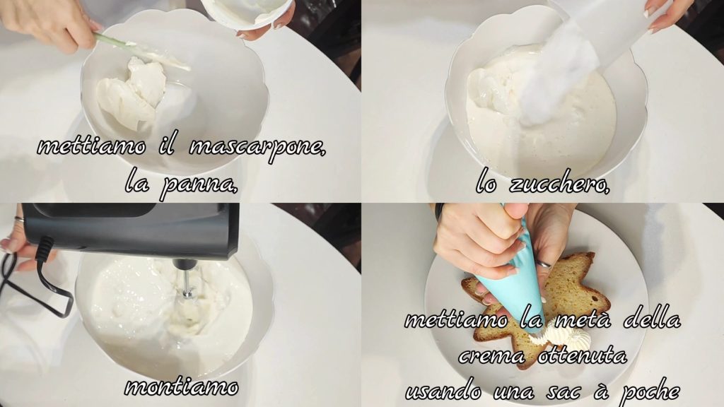 Em um recipiente, colocamos o mascarpone, o creme de leite, o açúcar e batemos com a batedeira até obter um creme denso e homogêneo. Transferimos para um saco de confeiteiro e colocamos uma camada de creme (cerca de metade) sobre a fatia molhada.
