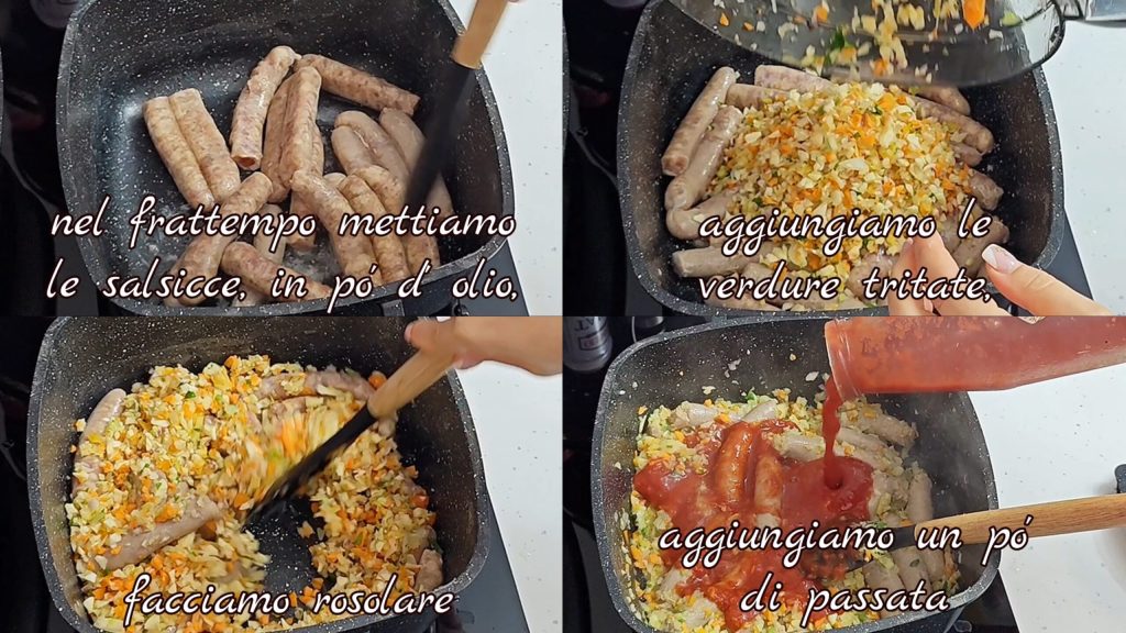 • Em uma frigideira grande, adicione um fio de óleo e refogue as linguiças, adicione a cebola picada, o alho, as cenouras e o aipo em fogo médio, até que os vegetais fiquem macios e dourados. Adicione o molho de tomate