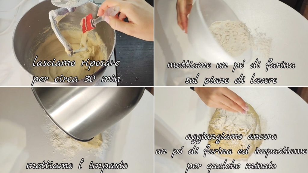 Deixamos descansar por cerca de 30 min. Colocamos sobre a bancada, adicionando um pouco de farinha e trabalhamos por alguns minutos.