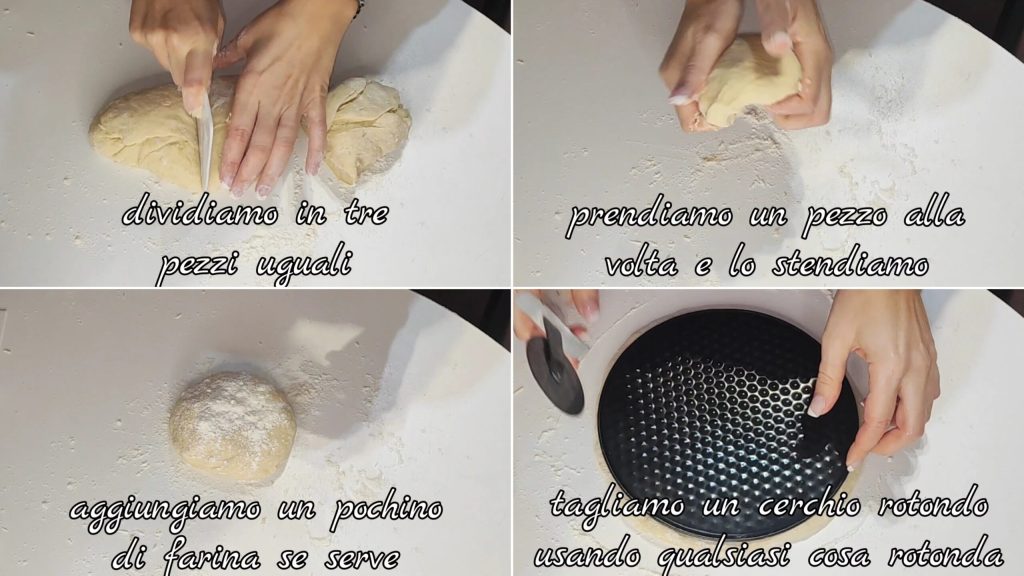 Dividimos a massa em 3 partes iguais. Pegamos um pedaço de cada vez e estendemos. Adicionamos um pouco de farinha se necessário e cortamos um círculo usando qualquer coisa redonda.