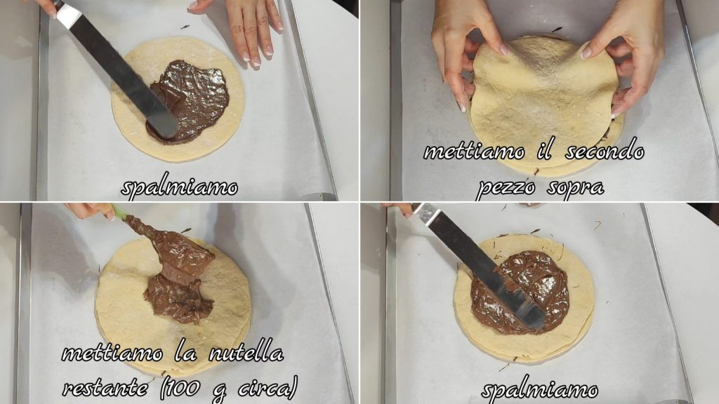 Removemos o excesso de massa e estendemos os outros 2 pedaços de massa. Colocamos o primeiro círculo em uma assadeira com papel manteiga dentro. Adicionamos cerca de 100 g de Nutella por cima.