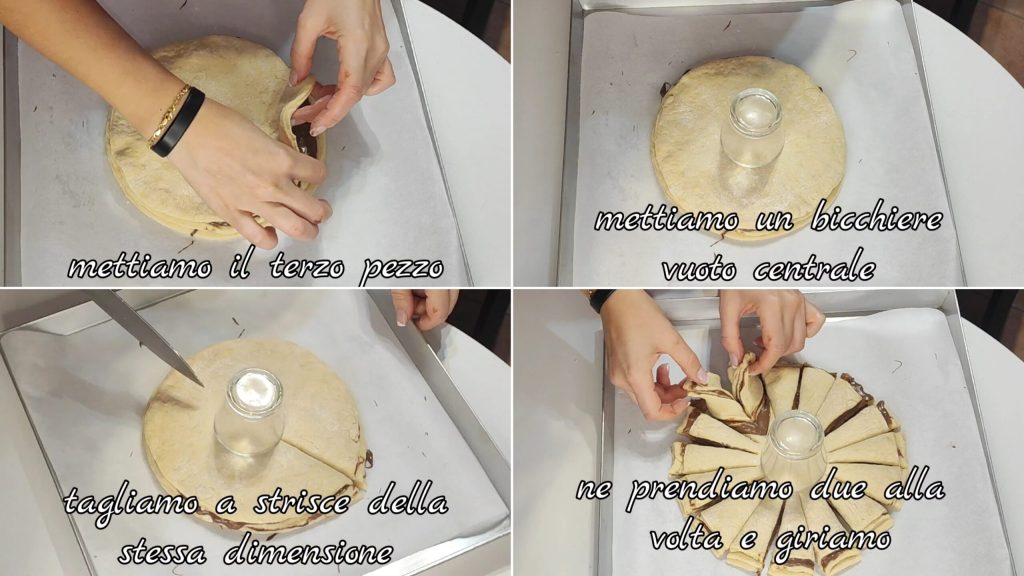 Colocamos o terceiro círculo por cima. Colocamos no centro um copo vazio central. Cortamos em tiras do mesmo tamanho. Pegamos duas tiras de cada vez e as giramos sobre si mesmas.