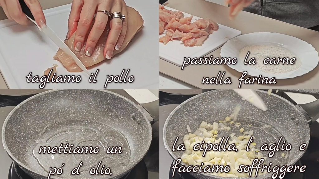 Primeiro cortamos o peito de frango e passamos na farinha. Em uma panela colocamos um pouco de óleo, a cebola picada, o alho e refogamos.