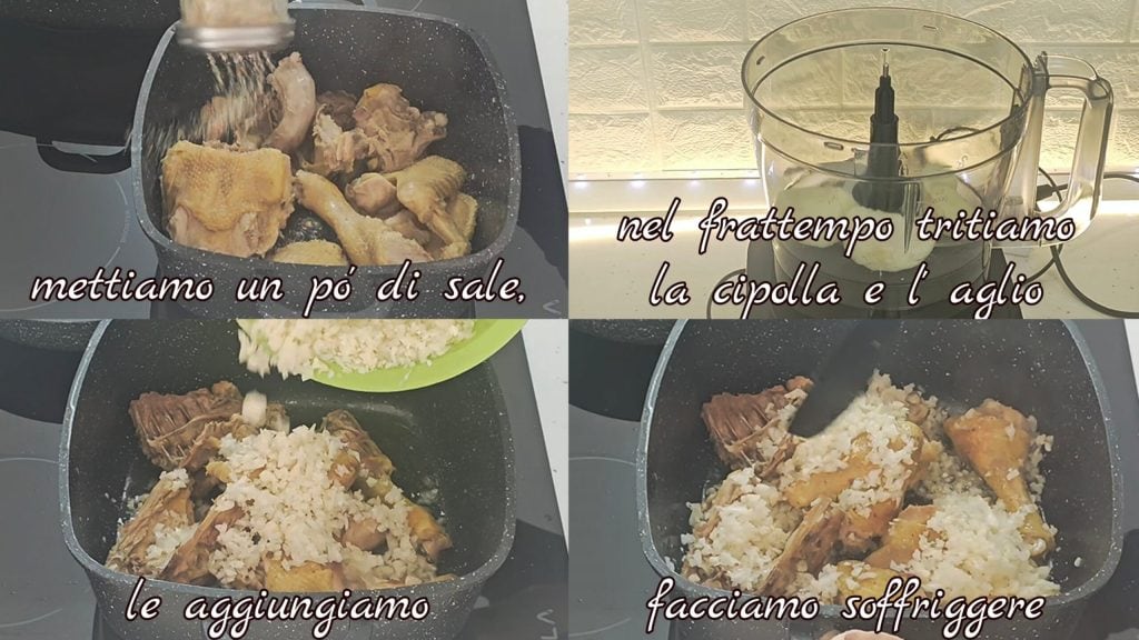 Colocamos um pouco de sal. Enquanto isso, tratamos o alho e a cebola e os adicionamos. Refogamos.