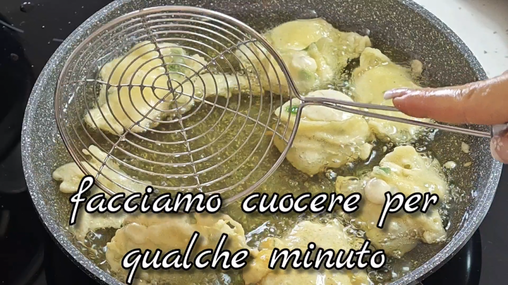 • Cozinhe por alguns minutos de um lado, depois vire as fritinhas e continue até dourarem por igual. Assim que estiverem douradas, escorra sobre papel absorvente para eliminar o excesso de óleo. Repita o procedimento até acabar toda a massa.