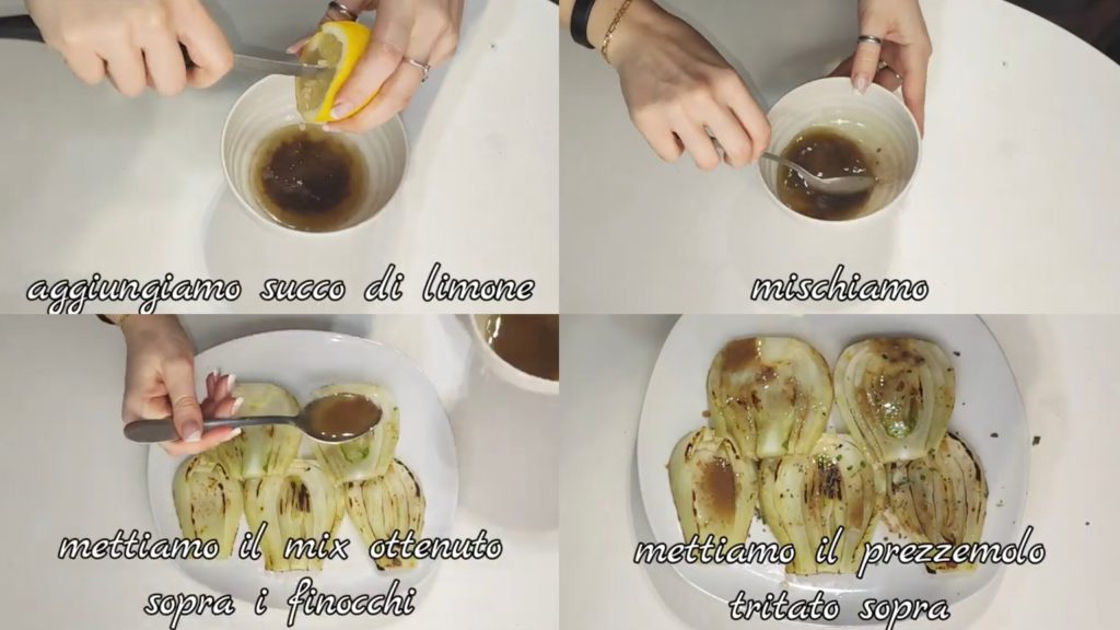 Adicionamos o suco do limão espremido e misturamos. Colocamos sobre o funcho o molho obtido, e adicionamos um pouco de salsa picada por cima.