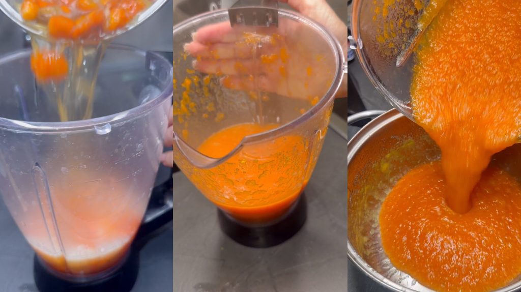 • Transferimos tudo para o liquidificador e batemos até obter um creme liso. Voltamos com a mistura para a panela e continuamos o cozimento por mais alguns minutos, até alcançar a consistência desejada.