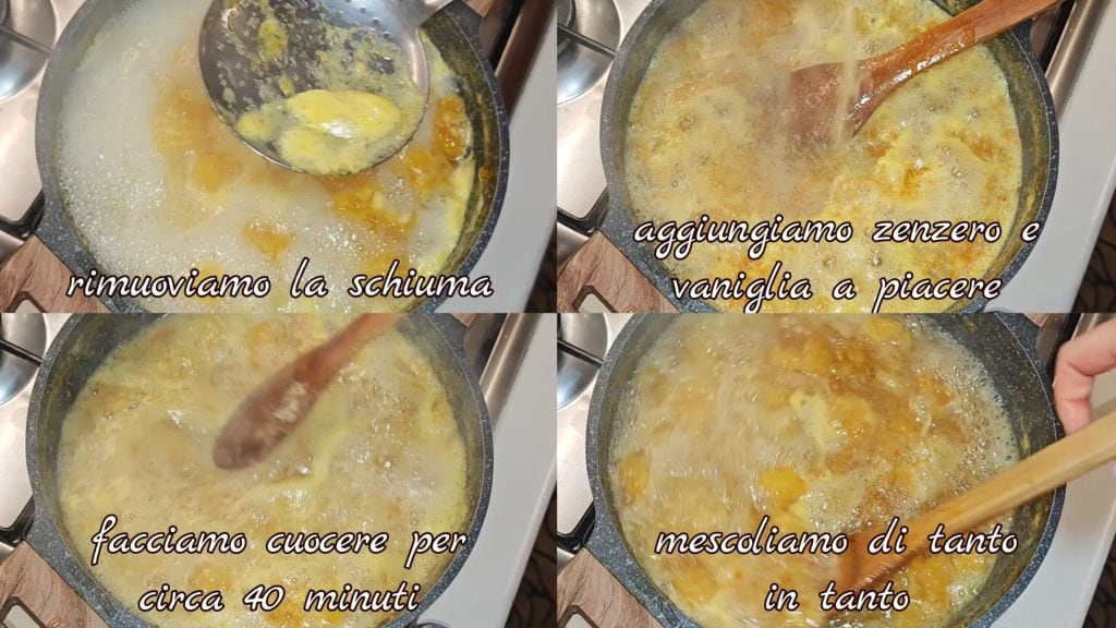 Removemos a espuminha que se forma durante o cozimento. Adicionamos gengibre e baunilha a gosto. Mexemos de vez em quando.