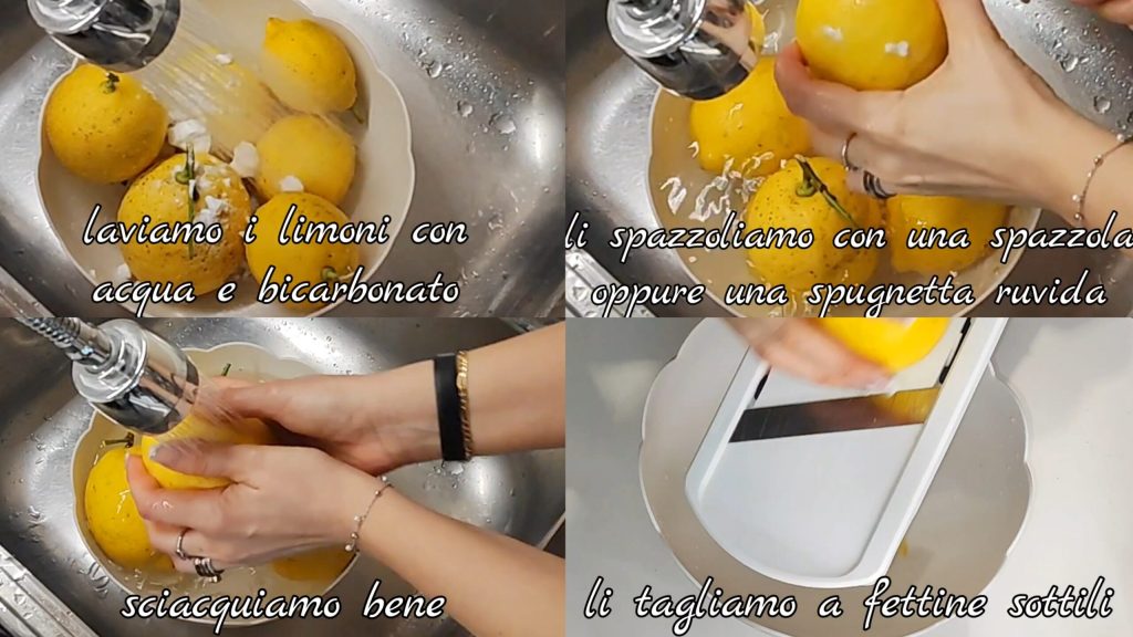 Primeiro, lavamos cuidadosamente os limões com água e bicarbonato. Limpamos a casca usando uma escova ou uma esponja áspera. Cortamos em fatias finas.