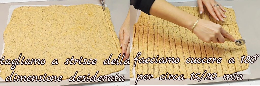 Cortamos em tiras do tamanho desejado e depois assamos a 180° por cerca de 15/20 min.