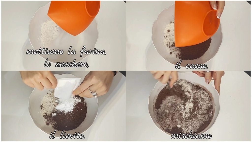 Em uma tigela, colocamos a farinha, o açúcar, o cacau, o fermento e misturamos.