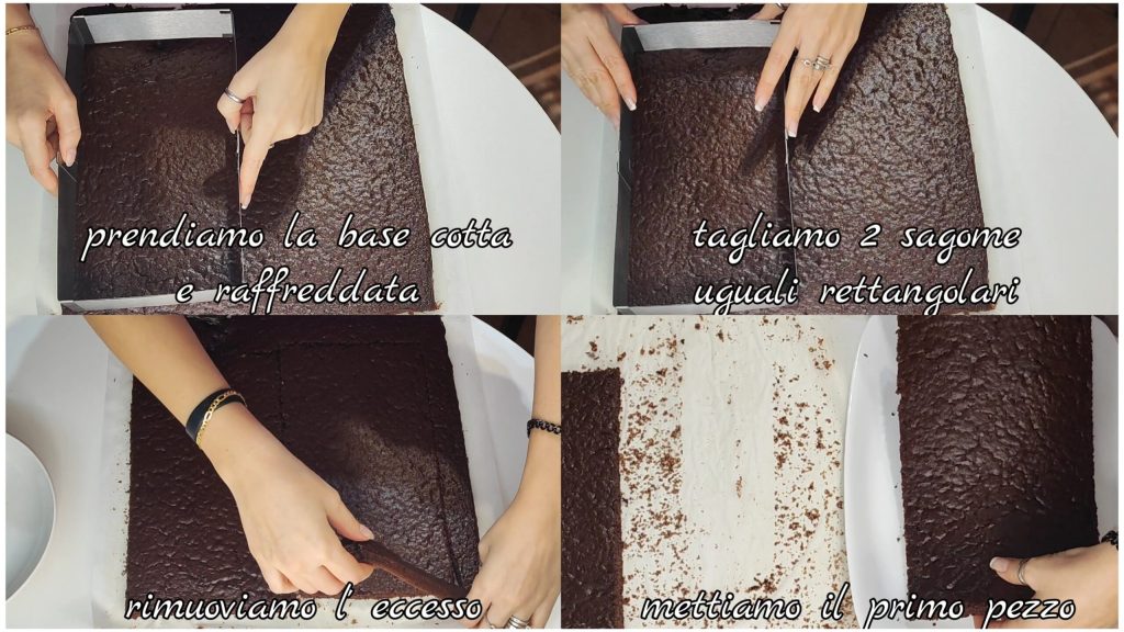 Pegamos a base assada e resfriada e cortamos duas formas retangulares iguais. Removemos o excesso. Colocamos a primeira parte.