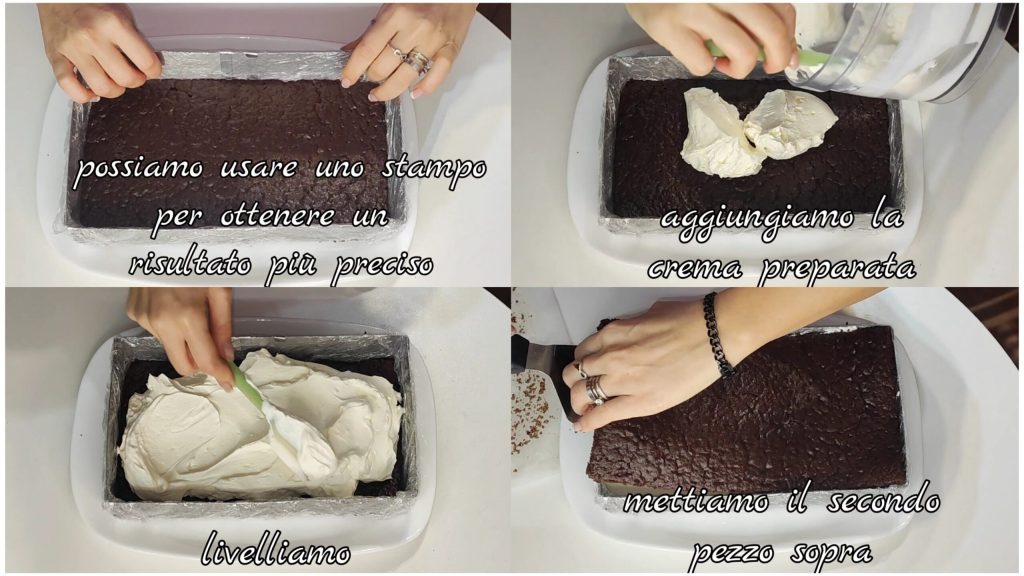(para um resultado mais preciso, podemos usar uma forma). Adicionamos o creme preparado e nivelamos bem. Colocamos a outra parte da base por cima.