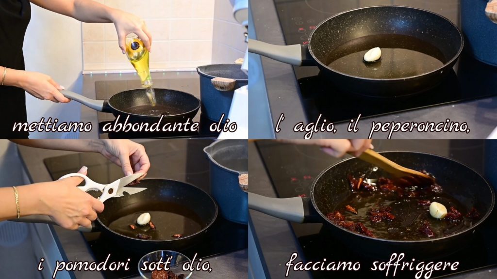 Na mesma panela, colocamos bastante azeite, alho, pimenta calabresa, o tomate seco em óleo e deixamos fritar.
