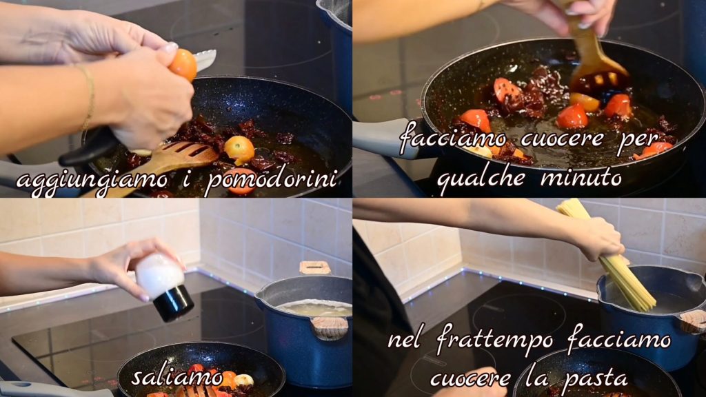 Adicionamos os tomatinhos frescos cortados e cozinhamos por alguns minutos. Salgamos. Enquanto isso, cozinhamos o macarrão