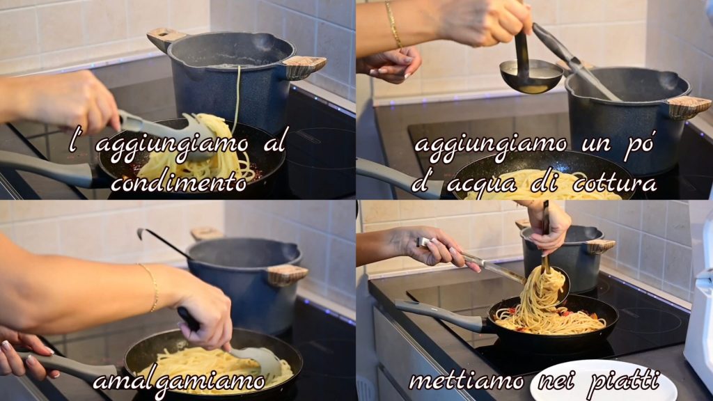 e adicionamos ao molho. Colocamos um pouco de água do cozimento e misturamos bem, depois colocamos nos pratos.