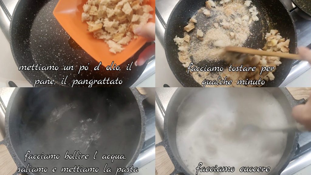 Em uma panela colocamos um pouco de óleo, o pão dormido cortado em cubos, a farinha de rosca e deixamos tostar por alguns minutos. Enquanto isso, fervemos a água, adicionamos sal e colocamos o macarrão para cozinhar.