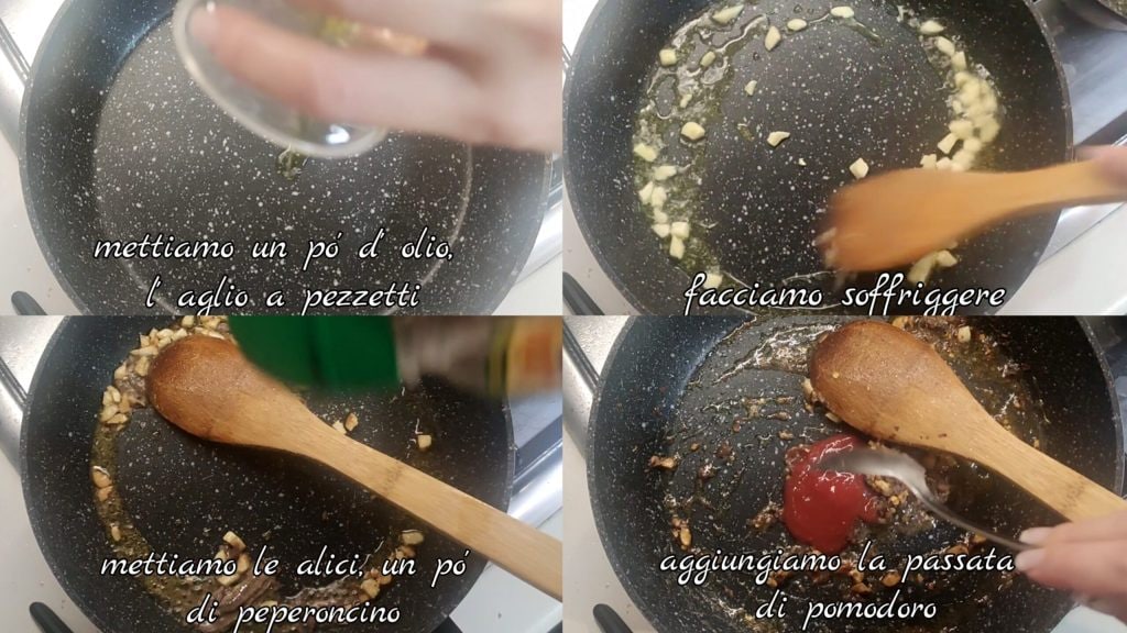 Em outra panela colocamos um pouco de óleo, o alho picado e deixamos refogar. Adicionamos as anchovas e um pouco de pimenta calabresa (opcional) e o purê.