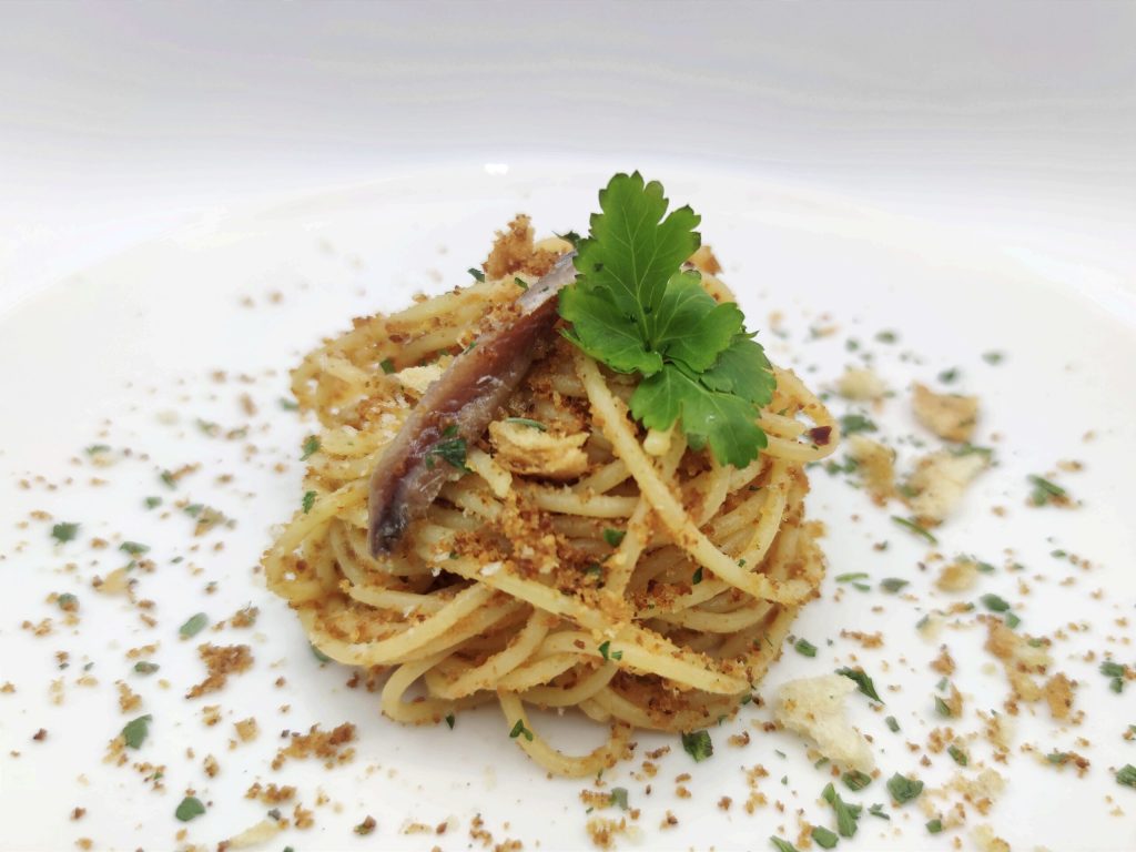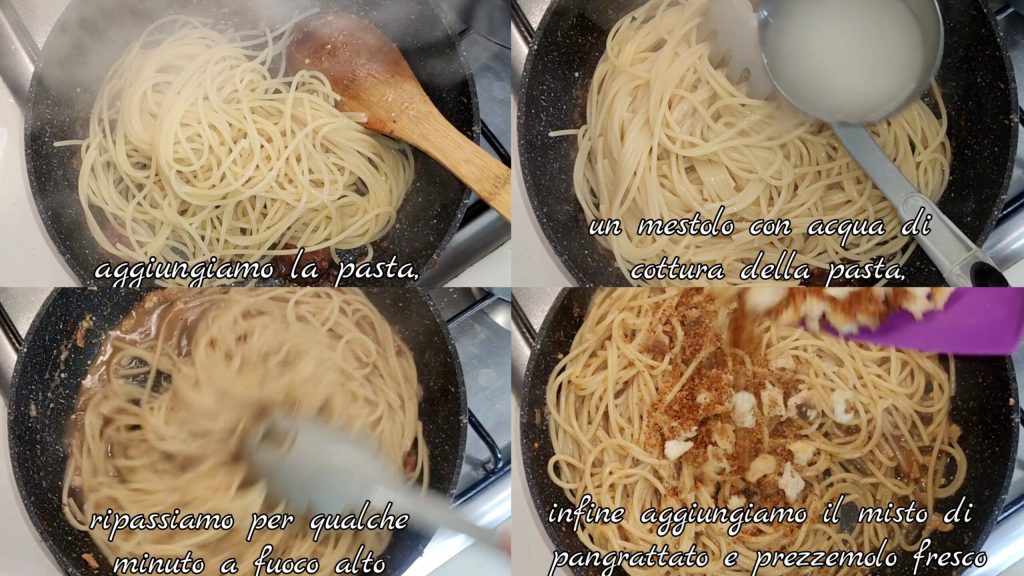Adicionamos o macarrão cozido e escorrido com uma concha de água do cozimento e misturamos por alguns minutos em fogo alto. Adicionamos a mistura de farinha de rosca e salsa fresca.