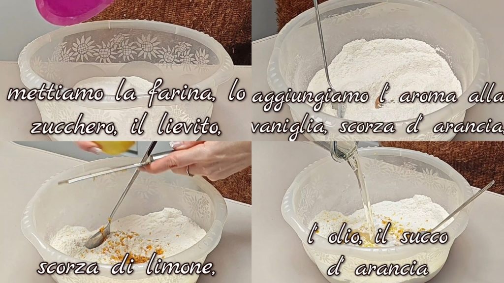 Em um recipiente, colocamos a farinha, o açúcar, o fermento, adicionamos a baunilha, as raspas de laranja, raspas de limão, o óleo, o suco de laranja