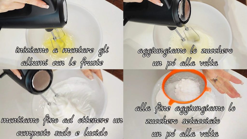 Começamos a bater as claras de ovo com a batedeira elétrica. Adicionamos o açúcar refinado aos poucos e batemos até obter uma mistura firme e brilhante. No final, adicionamos o açúcar de confeiteiro peneirado, aos poucos.