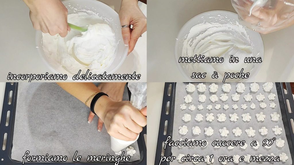 Misturamos delicadamente com movimentos de baixo para cima. Transferimos a mistura obtida para um saco de confeitar e formamos as merengues em uma assadeira com papel manteiga dentro ou podemos fazê-las usando duas colheres de chá, dependendo da forma que queremos obter. Deixamos um pouco de espaço entre elas. Assamos a 90° por cerca de 1 hora e meia.