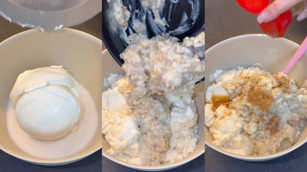 Em uma tigela coloco a ricota e o açúcar e misturo bem.