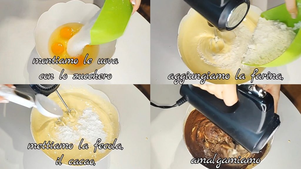 Comece a bater os ovos com o açúcar até obter uma mistura clara e cremosa. Adicione a farinha, a fécula, o cacau e misture.