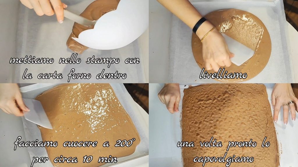 Coloque a mistura obtida em uma forma forrada com papel manteiga. Nivelar. Asse a 200° por cerca de 10 min. Uma vez pronto, vire-o.