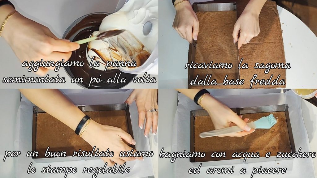 Adicione o chantilly semibatido aos poucos e misture. Pegue a base fria e corte no formato desejado. Para um bom resultado, use um aro ajustável. Umedeça a base com água, açúcar e aromas a gosto.