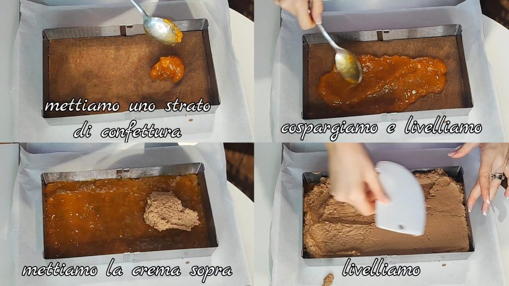 Espalhe uma camada de geleia por cima. Adicione o creme preparado por cima e nivele.