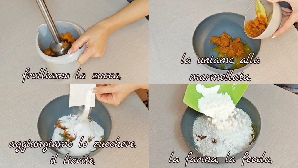 Primeiro, batemos a abóbora cozida e resfriada e a misturamos com a geleia. Adicionamos o açúcar, o fermento, a farinha, a fécula,