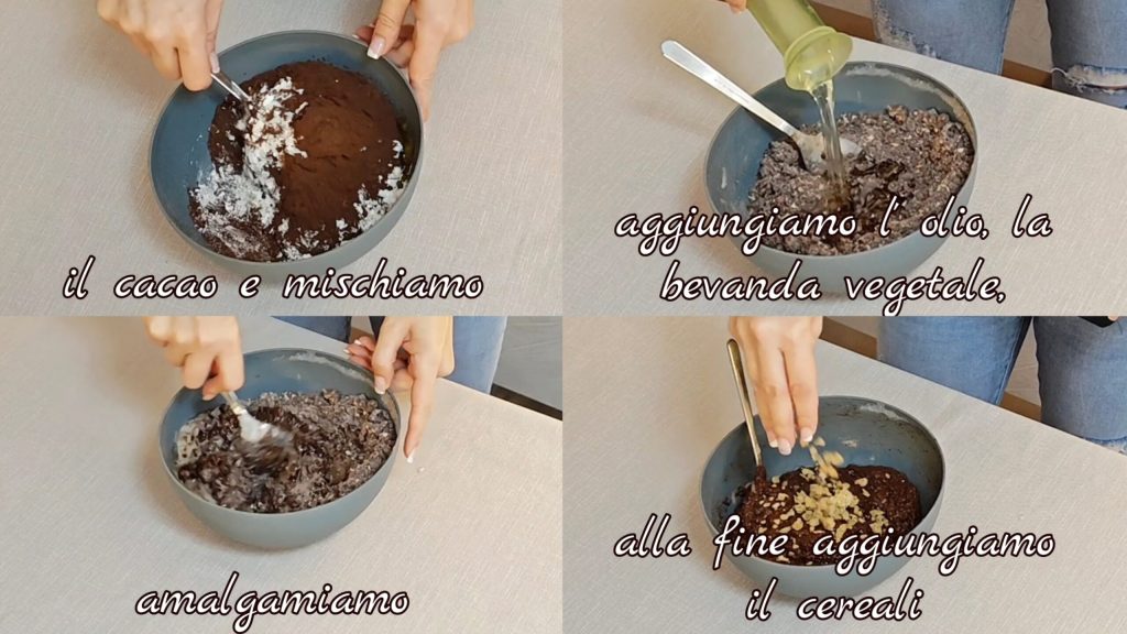 Adicionamos o cacau e misturamos. Adicionamos o óleo, a bebida vegetal e misturamos. No final, adicionamos os cereais e misturamos.