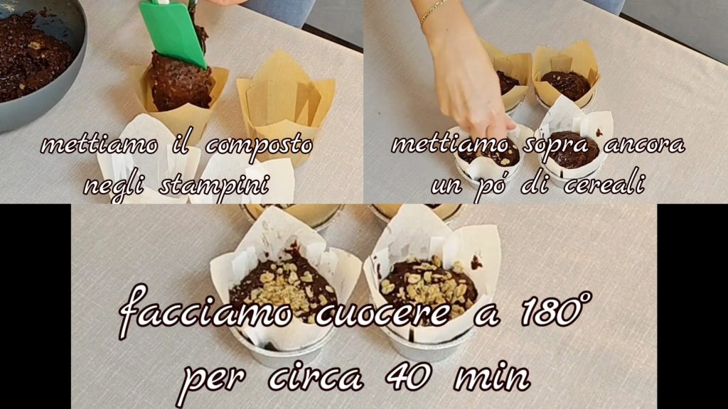 Colocamos a mistura nas formas. Colocamos mais um pouco de cereais por cima e assamos a 180º por cerca de 40 minutos.