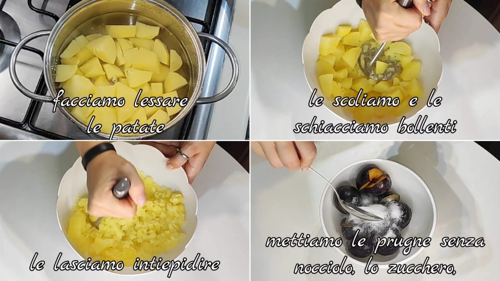 Colocamos uma ameixa no centro e fechamos formando uma bolinha. Colocamos as bolinhas obtidas em um prato enfarinhado. Continuamos assim até esgotar toda a massa. Se as ameixas forem muito grandes, podemos cortá-las ao meio.